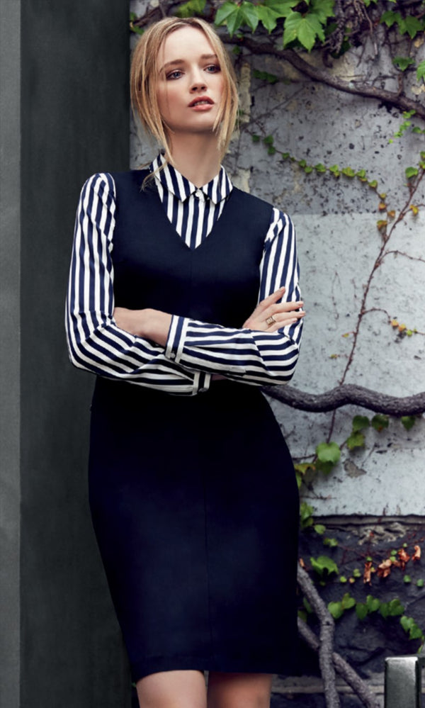 Elegant dress designed to be worn on its own or layered. With natural drape, full lining and a concealed back zip.