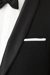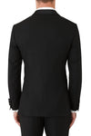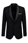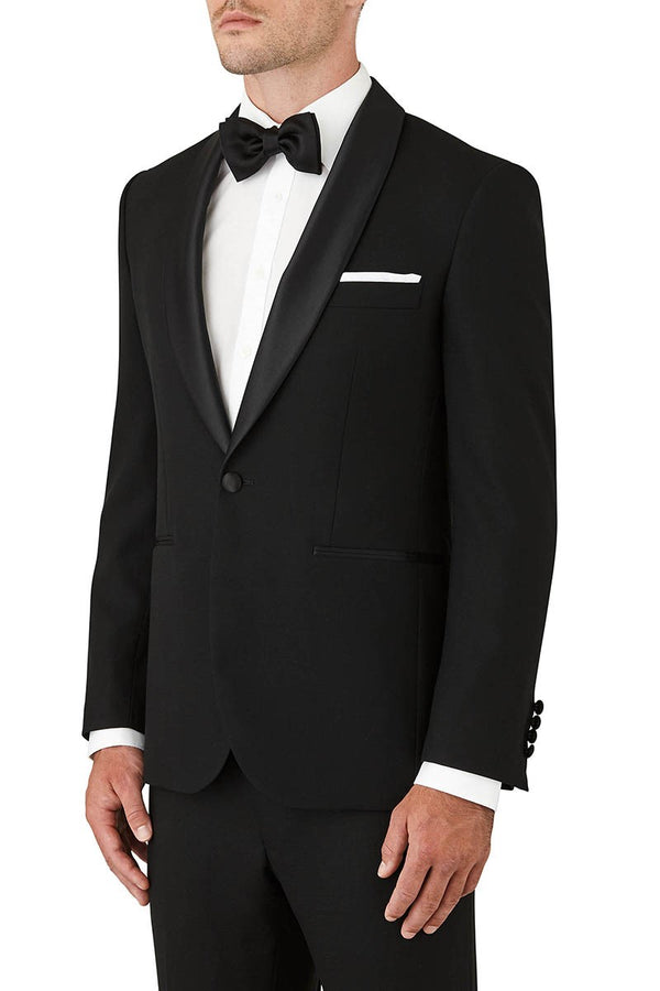 The elegant Fortress tuxedo style jacket in super 120’s Australian merino wool has a beautiful drape, and the subtle crêpe texture in the weave makes this is our blackest black. Featuring a wider black satin shawl lapel and satin covered buttons., this jacket pairs back with the Solidus trouser.